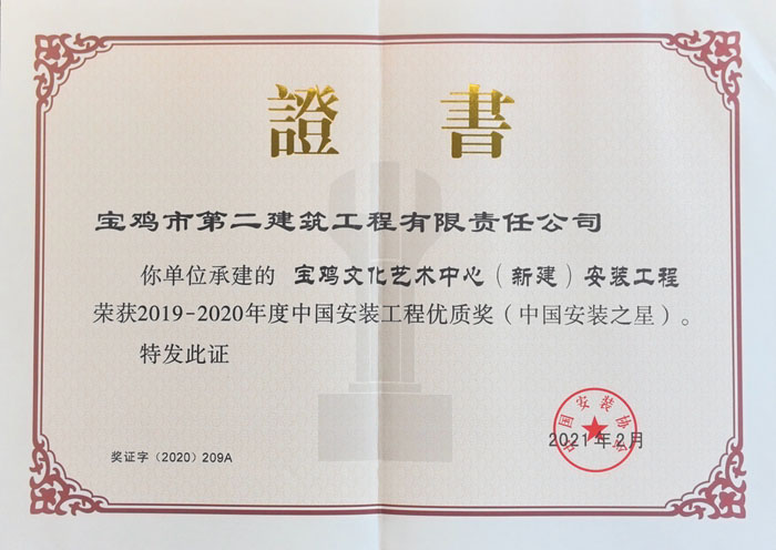 ?2019~2020年度中國安裝工程優(yōu)質(zhì)獎(寶雞文化藝術中心(新建)安裝工程)